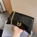 The Balenciaga Hourglass XS Top Handle Bag is a sculptural piece inspired by Cristóbal Balenciaga’s iconic Basque-waist tailoring. Crafted in Italy, it features a curved silhouette, a bold B-logo plaque, and a magnetic flap closure. The bag includes a top handle and a detachable, adjustable crossbody strap for versatile styling. With dimensions of approximately 19 x 13 x 7.5 cm, it offers compact yet functional space for essentials. Available in various finishes, including satin, leather, and embellished suede, this bag combines timeless elegance with modern flair.