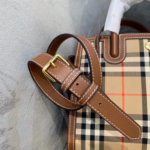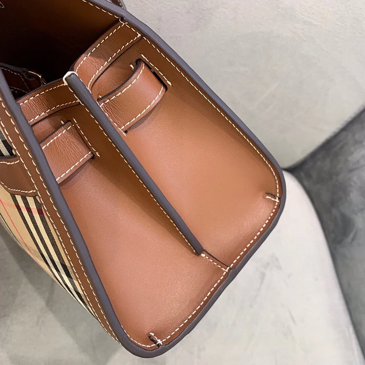 - The Burberry Mini Vintage Check Two-handle Title Bag in Archive Beige is a compact and elegant accessory that showcases the brand’s iconic design. Crafted from durable cotton canvas with leather accents, it features the signature Vintage Check pattern in Archive Beige. The bag is equipped with two leather top handles and a detachable, adjustable shoulder strap, offering versatile carrying options. Its structured silhouette is complemented by gold-tone hardware, adding a touch of sophistication. With dimensions of approximately 10.2 inches (W) x 7.9 inches (H) x 5.3 inches (D), this Italian-made bag is perfect for everyday use, combining timeless style with practicality.