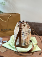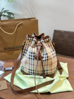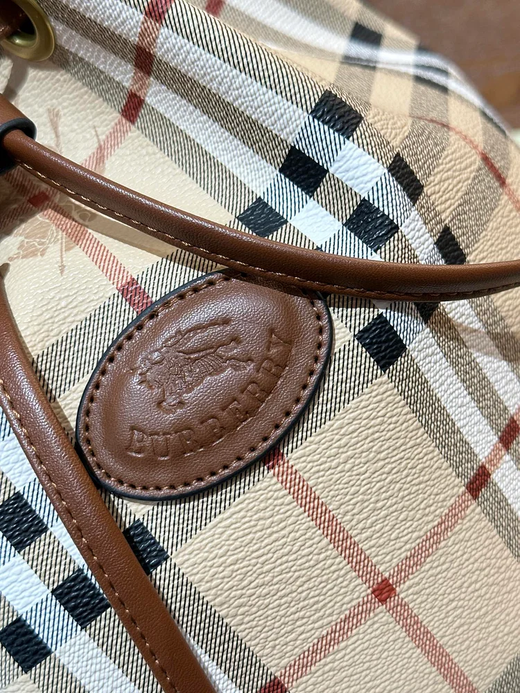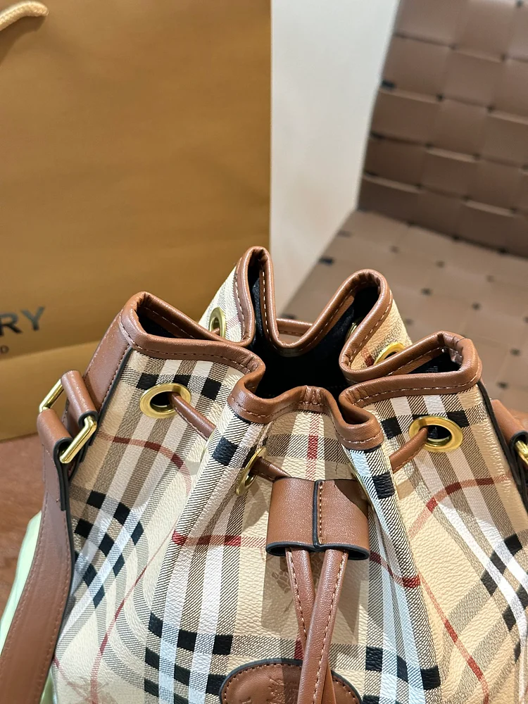 - The Burberry Mini TB Bucket Bag in Dark Birch Brown is a compact and stylish accessory that showcases the brand’s iconic design. Crafted in Italy from Burberry Check fabric, it features a drawcord closure and a softly structured shape. The bag is lined in a cotton blend and includes a top handle and a detachable, adjustable strap, allowing it to be worn as a crossbody or carried by hand. With dimensions of approximately 16.5 x 11 x 18.5 cm (6.5 x 4.3 x 7.3 inches), this bag is perfect for everyday use, combining timeless style with practicality.