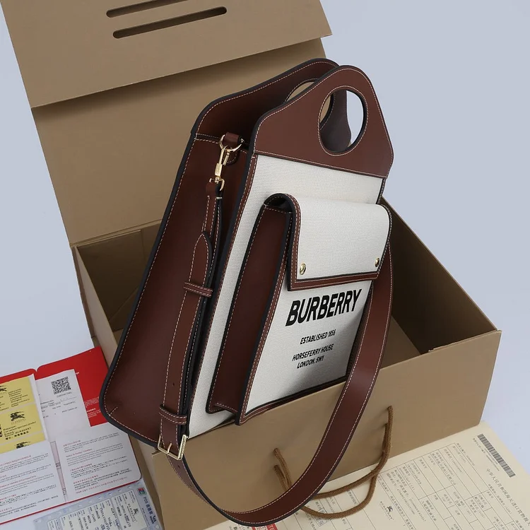 - The Burberry Medium Pocket Bag is a sophisticated, archive-inspired tote crafted from topstitched calf leather. It features a front flap pocket embossed with the Burberry logo, offering both style and practicality. Designed for versatility, it can be carried by the reinforced leather top handles or worn using the detachable, adjustable shoulder strap. The bag’s open-top design provides easy access to essentials, while the interior includes two slip pockets for organization. Hand-painted edges and polished metal hardware add refined finishing touches. Made in Italy,