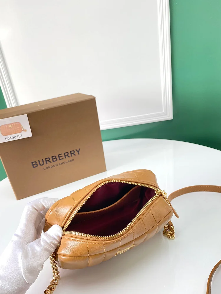 A softly structured, quilted camera bag made from luxurious Italian-tanned lambskin leather. Accented with a polished Thomas Burberry Monogram and a chain-and-leather adjustable strap, it offers versatile styling—wear it on the shoulder or as a crossbody.