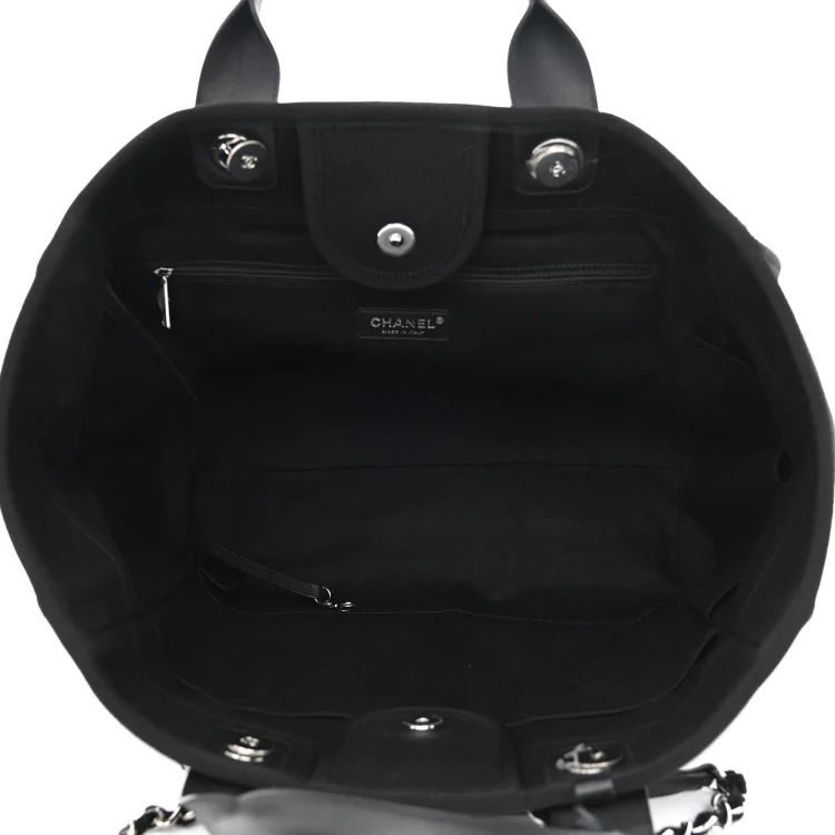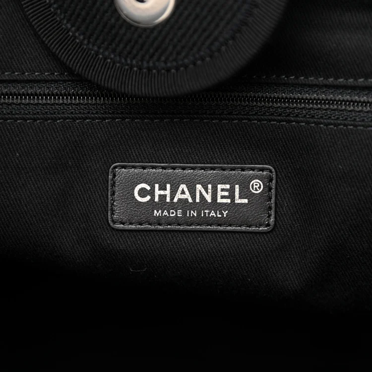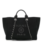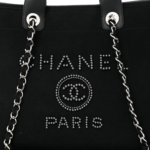 The CC Canvas Pearl Medium Deauville Tote in Black exudes effortless sophistication. Featuring elegant pearl accents and crafted from durable canvas, this tote offers a roomy interior—perfect for daily use while adding a timeless, chic touch to any outfit.