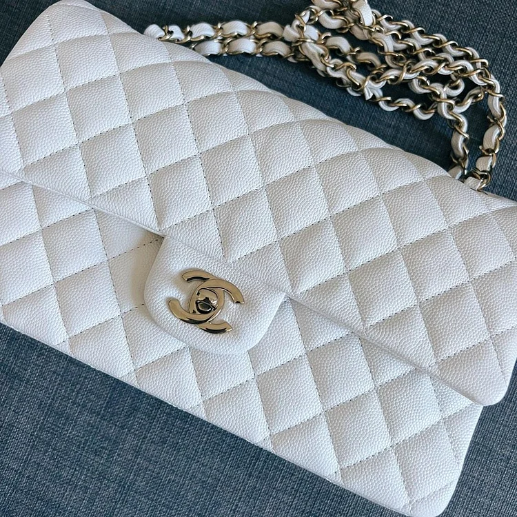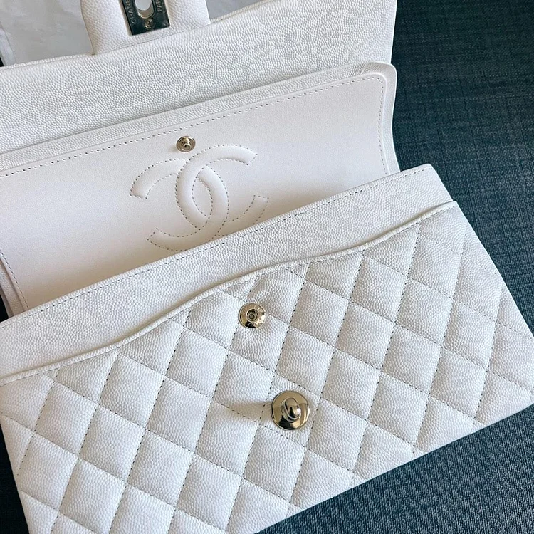 The CC CF 25 in white caviar leather is a timeless classic, featuring a structured silhouette, luxurious grained texture, and elegant silver-tone chain hardware. Sophisticated and versatile, it’s the perfect accessory to elevate any look.
