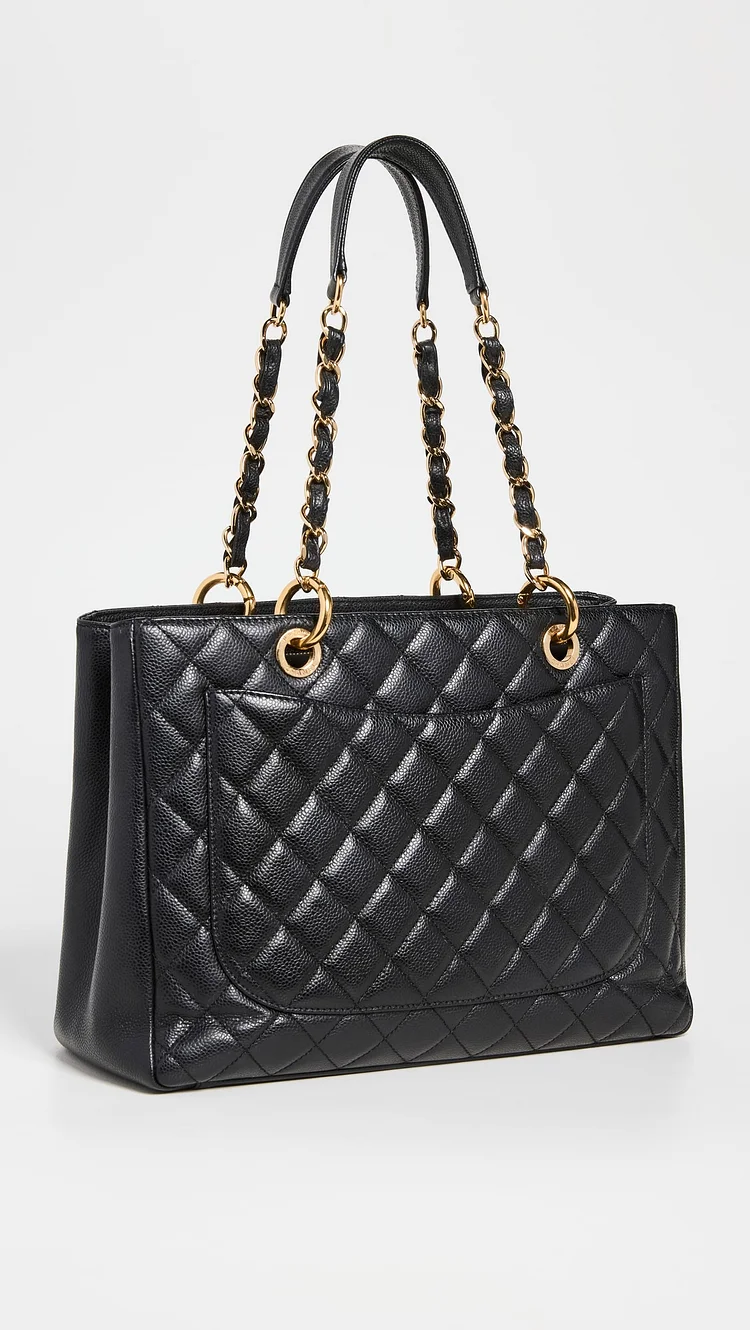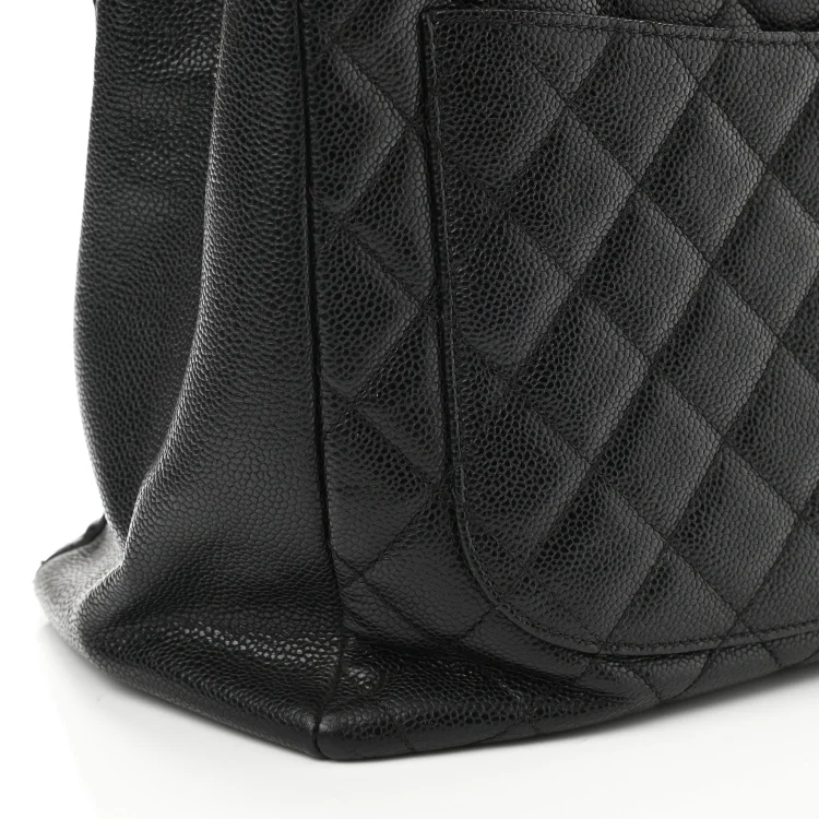 This is an authentic CC Caviar Quilted Grand Shopping Tote (GST) in Black. Crafted from luxurious black diamond-quilted caviar leather, this elegant tote features: