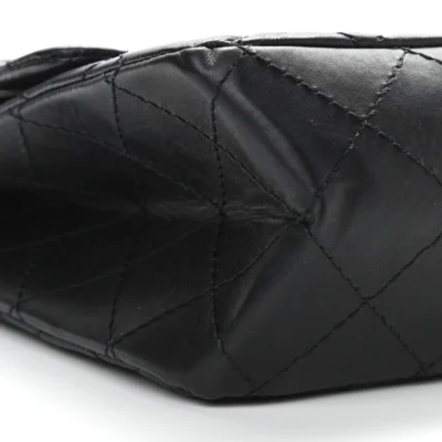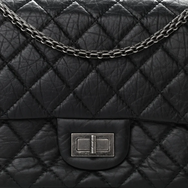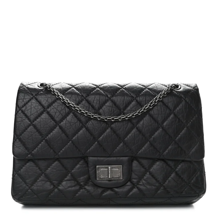 This is an authentic CC Aged Calfskin Quilted 2.55 Reissue 226 Flap Bag in Black. Crafted from aged diamond-quilted calfskin leather, this elegant shoulder bag features a ruthenium reissue chain strap and a signature Mademoiselle turn-lock closure on the crossover flap. The bag opens to reveal an inner flap, a front pocket, and a burgundy leather interior with patch pockets for organization