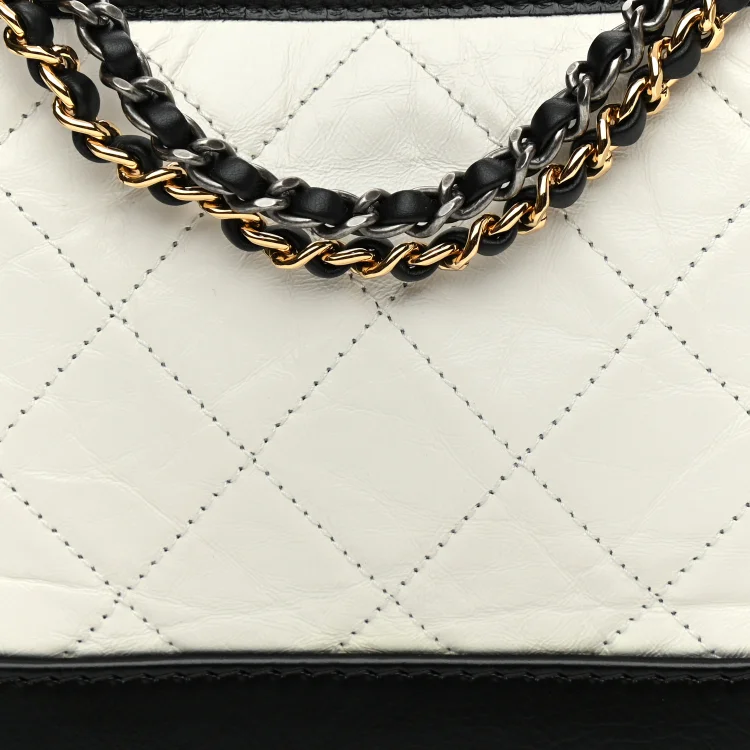This is an authentic Chanel Aged Calfskin Quilted Small Gabrielle Hobo in Black and White. This stylish shoulder bag is crafted from diamond-quilted aged calfskin leather in white, complemented by a sturdy black leather base. It features a black leather-threaded chain-link shoulder strap with polished gold, silver, and aged ruthenium hardware. The top zipper opens to reveal a deep red fabric interior with multiple pockets for organization.