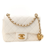 This is an authentic CC Lambskin Quilted CC Pearl Crush Mini Flap in White. Crafted from quilted white lambskin leather, this mini crossbody bag features a gold chain-link shoulder strap interwoven with leather and a signature gold CC turn-lock closure. The flap opens to a gold leather interior with pockets.