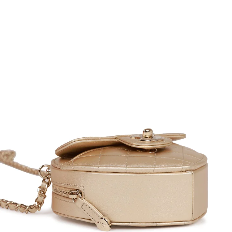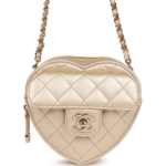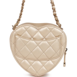 This CC In Love Heart Clutch with Chain is crafted from pink lambskin leather and accented with light gold-tone hardware. It features a front flap with the iconic CC turn-lock closure, a half-moon back pocket, a zip-top closure, and an interwoven light gold-tone chain and pink leather shoulder strap. The interior is lined in matching pink fabric.