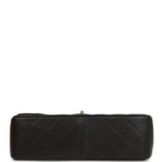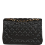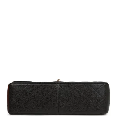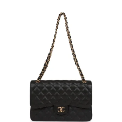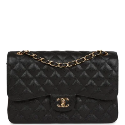 This Jumbo Classic Double Flap Bag is crafted from black caviar leather with gold-tone hardware. It features a front flap with the iconic CC turnlock closure, a half-moon back pocket, and an adjustable interwoven gold-tone chain and black leather shoulder strap.
