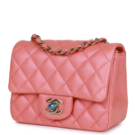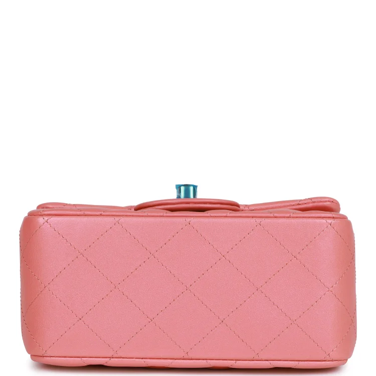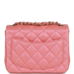 This Mini Square Flap Bag is crafted from pink iridescent lambskin with silver-tone hardware. It features a classic front flap with the iconic CC turn-lock closure, a rear half-moon pocket, and a single interwoven pink leather and silver-tone chain link strap for shoulder or crossbody wear.