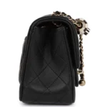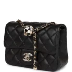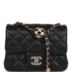 The CC Pearl Crush Mini Square Flap Bag in Black Lambskin features elegant quilted leather, antique gold hardware, and a signature pearl-detailed sliding chain strap. Compact yet chic, it’s perfect for adding timeless charm to any look.