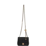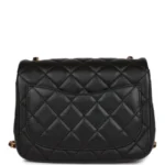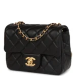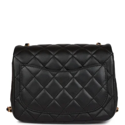 The CC Pearl Crush Mini Square Flap Bag is crafted from luxurious black lambskin leather and features antique gold hardware. Its signature quilted finish is paired with an elegant pearl-detailed adjustable chain, blending timeless design with a touch of playful sophistication. Perfect for effortless everyday chic.