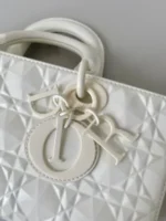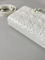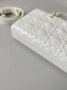 The Dior Lady D-Joy Bag is a contemporary reinterpretation of the iconic Lady Dior, showcasing a sleek horizontal silhouette that embodies the House’s vision of elegance and beauty. Crafted from luxurious materials such as lambskin with Dior’s signature Cannage stitching, the bag is adorned with pale gold-finish ‘D.I.O.R.’ charms, adding a touch of sophistication.