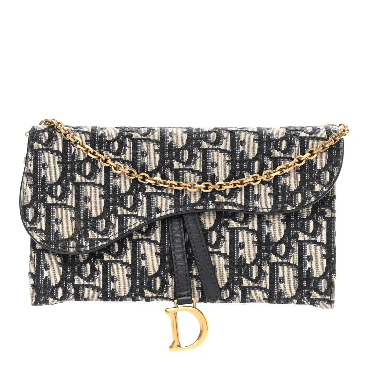 The Christian Dior Oblique Saddle Chain Long Wallet in Blue is a sophisticated accessory that combines the iconic Saddle silhouette with functional design. Crafted from Dior’s signature blue Oblique jacquard canvas, this wallet features a tonal smooth calfskin flap and is adorned with antique gold-finish metal CD signature hardware. The wallet includes a detachable chain strap, allowing it to be worn as a clutch or carried on the shoulder for added versatility.