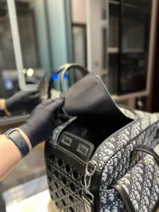 The Dior Hit the Road Pet Carrier Bag is a luxurious and functional accessory designed for stylish pet travel. Measuring 39 x 20 x 32 cm, it offers ample space for small pets while maintaining a sleek profile.