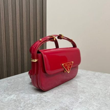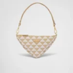 This mini-bag boasts a silhouette inspired by Prada’s signature geometric design. It features the enameled metal triangle logo on the front, creating a sophisticated contrast of textures. The bag is equipped with a metal chain handle and a detachable, adjustable leather shoulder strap. Additional details include metal hardware, a zipper closure, and a logo-print nylon lining.