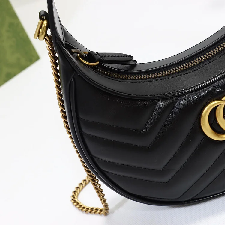- Chic and compact, the GG Marmont Half-Moon Mini Bag features a sleek crescent silhouette crafted in soft matelassé leather. Accented with the signature Double G hardware, this versatile piece includes a detachable chain strap for effortless crossbody or shoulder wear—perfect for day-to-night styling.🚚 Fast Shipping: Get your Handbag in just 7 to 9 working days!
