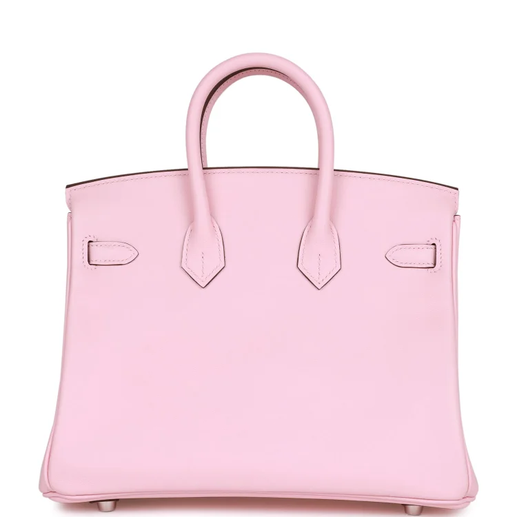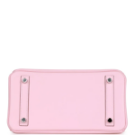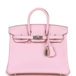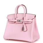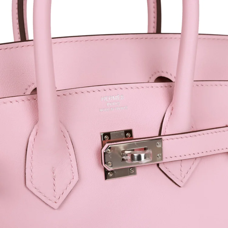 This Hermès Birkin is crafted from Rose Sakura Swift leather with palladium hardware, featuring tonal stitching, a front flap, two straps with a center toggle closure, a clochette with a lock and two keys, and double rolled handles.