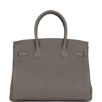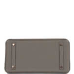 This Hermès Birkin is crafted from Gris Meyer Togo leather with rose gold hardware, featuring tonal stitching, a front flap, two straps, and a center toggle closure. It includes a clochette with a lock and two keys, along with double rolled handles.
