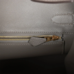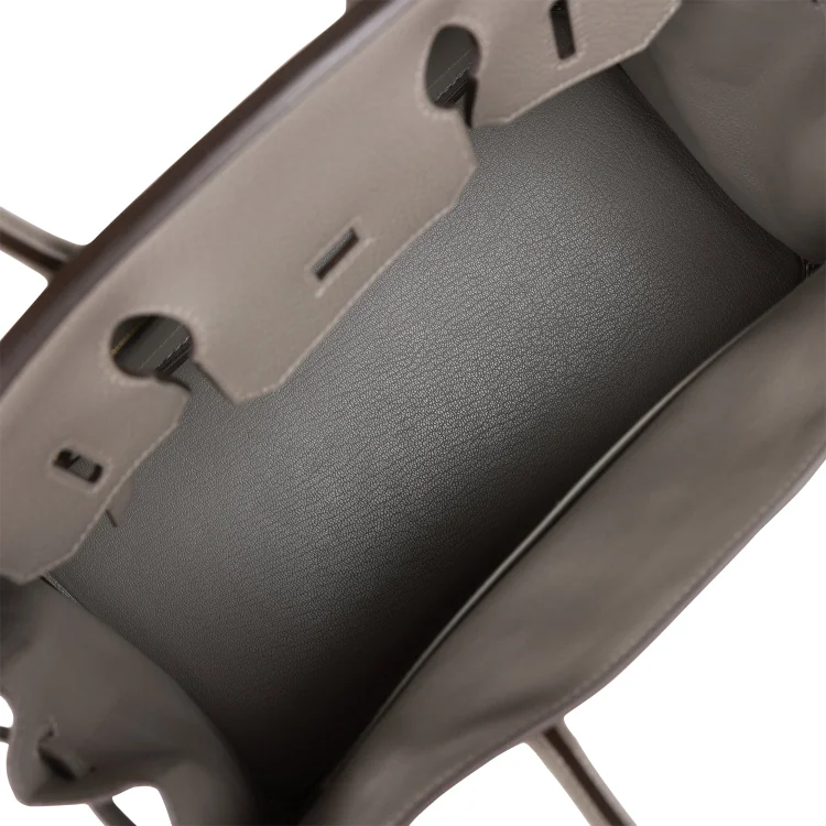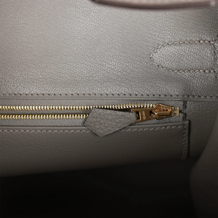 The interior is lined with Gris Meyer chèvre leather and offers a zip pocket with an H-engraved zipper pull, as well as an open pocket on the opposite side.