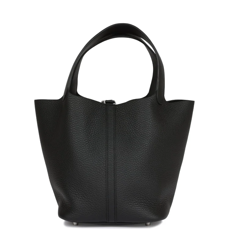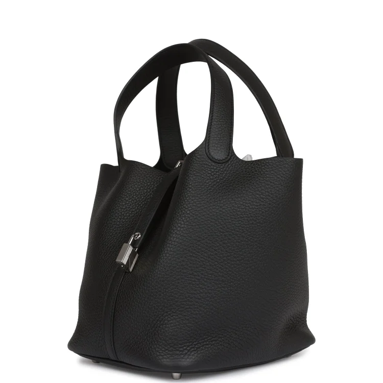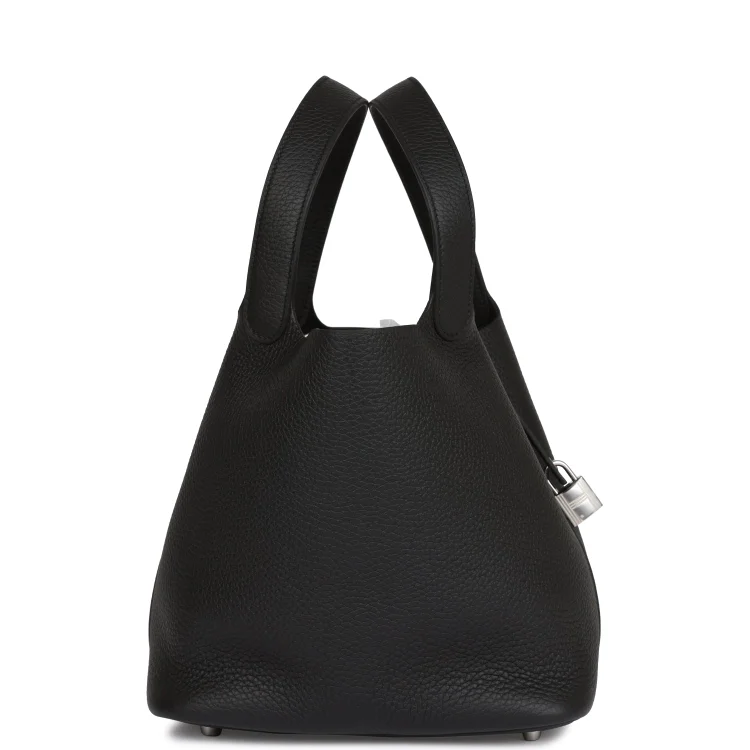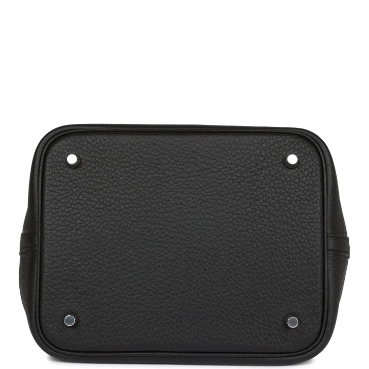 This Picotin Lock is crafted from Black Clemence leather with palladium hardware, featuring tonal stitching and two sturdy top handles.