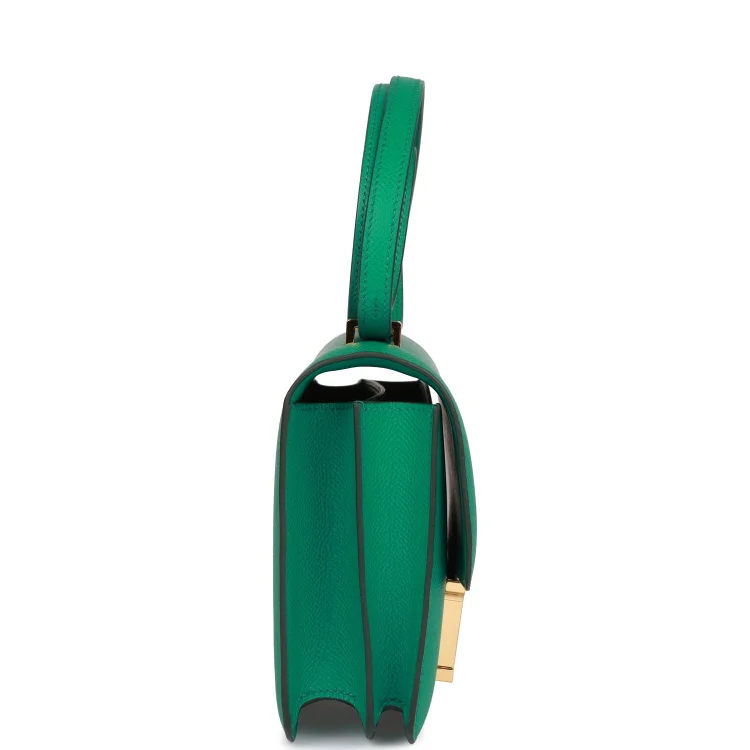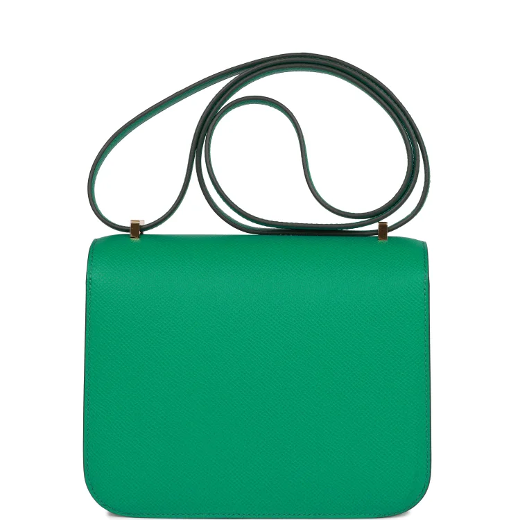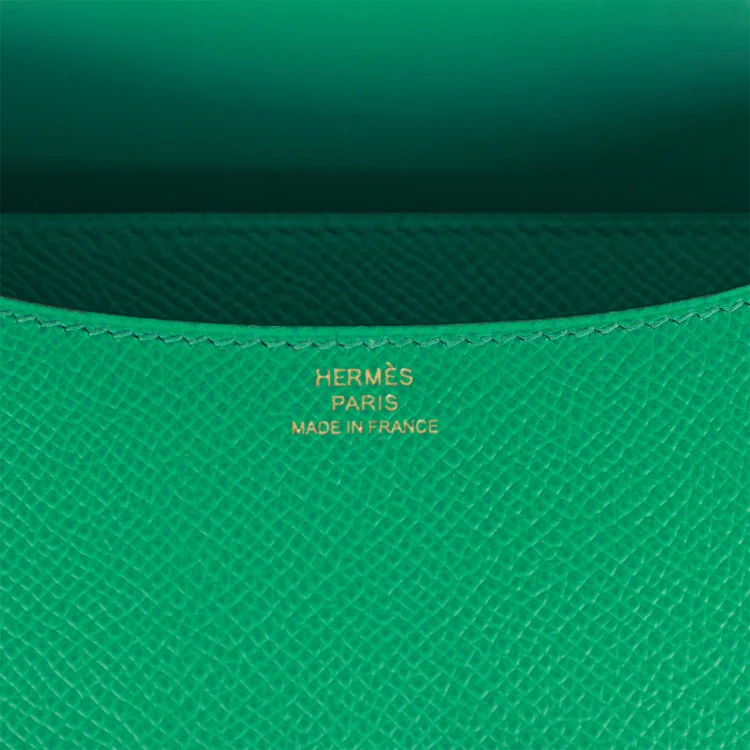 This Hermès Constance is crafted in elegant Vert Jade Epsom leather with gold hardware and tonal stitching. It features the iconic metal ‘H’ snap-lock closure and an adjustable shoulder strap for versatile wear.