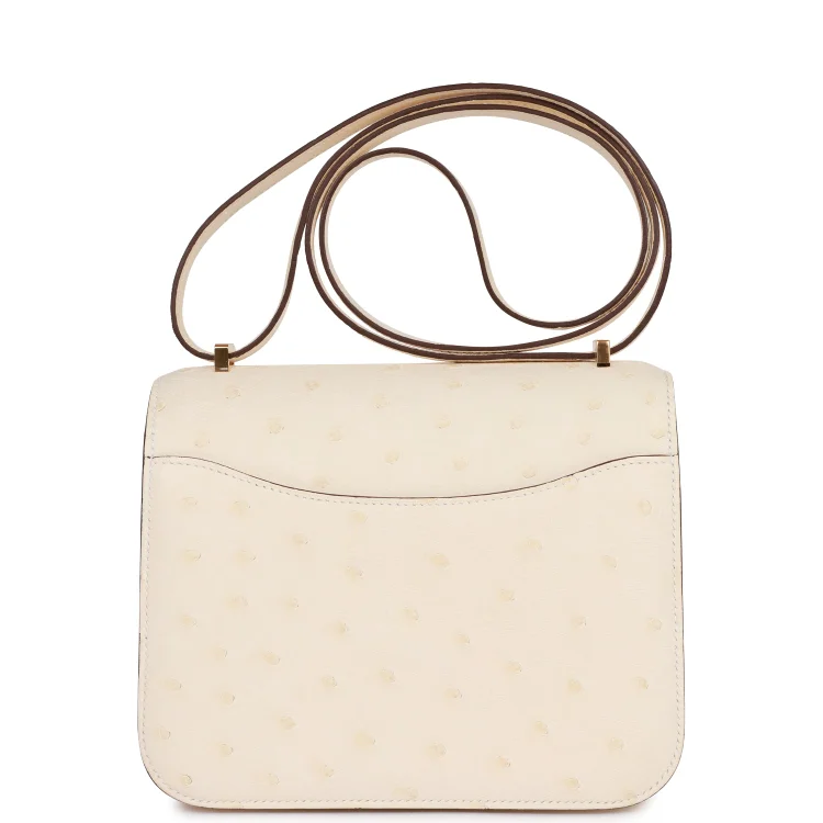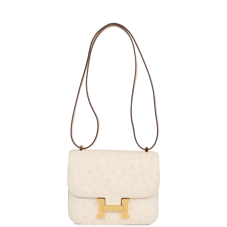 This Hermès Constance is crafted from luxurious Nata ostrich leather with gold hardware, showcasing tonal stitching, the iconic ‘H’ snap lock closure, and an adjustable shoulder strap for versatile wear.