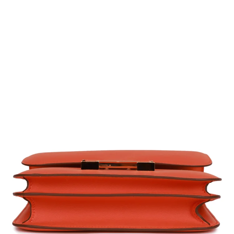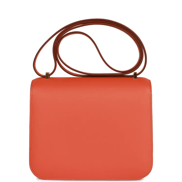 This Hermès Constance is crafted in vibrant Orange Swift leather with gold hardware, featuring tonal stitching, the iconic metal ‘H’ snap lock closure, and an adjustable shoulder strap for versatile styling.