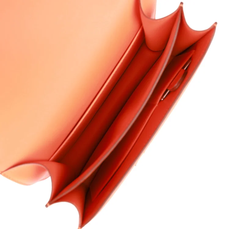 The interior is lined with Orange lambskin and includes an open pocket on the front wall, a center divider, and a slit pocket on the back wall—designed for elegant organization.