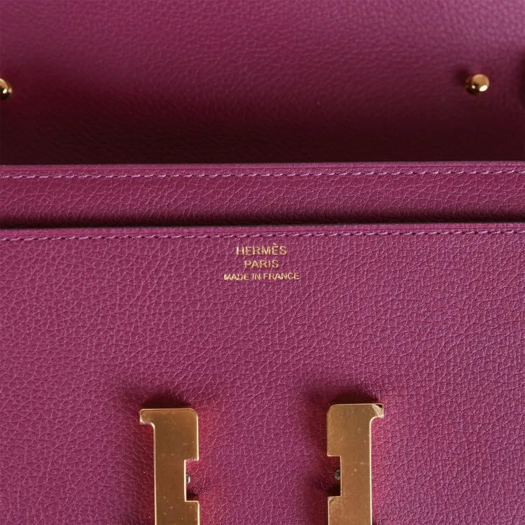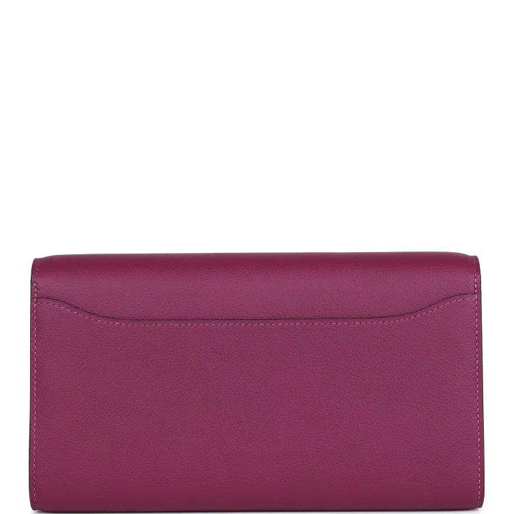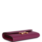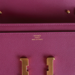 This Hermès Constance Wallet To Go is crafted in striking Anemone Evercolor leather with gold hardware and features tonal stitching, a signature metal ‘H’ snap lock closure, a front slip pocket, and a removable crossbody strap for versatile wear.