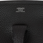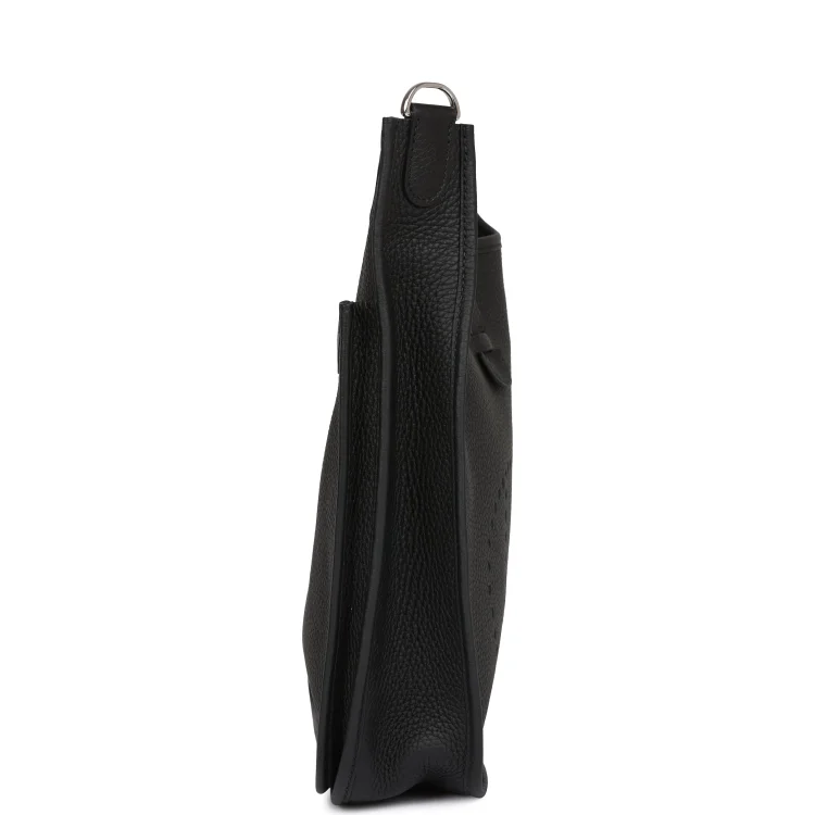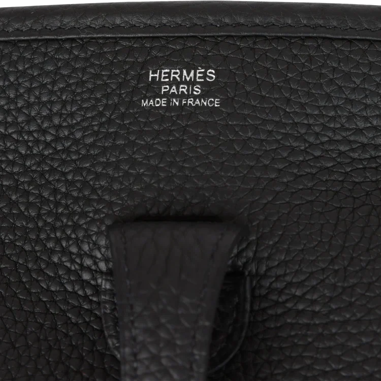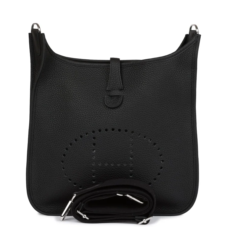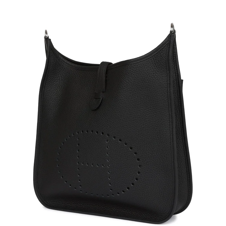- This Evelyne is inBlack clemence leather withpalladium hardware and has tonal stitching. pull tab top closure andBlack removable canvas and leather shoulder/crossbody strap.