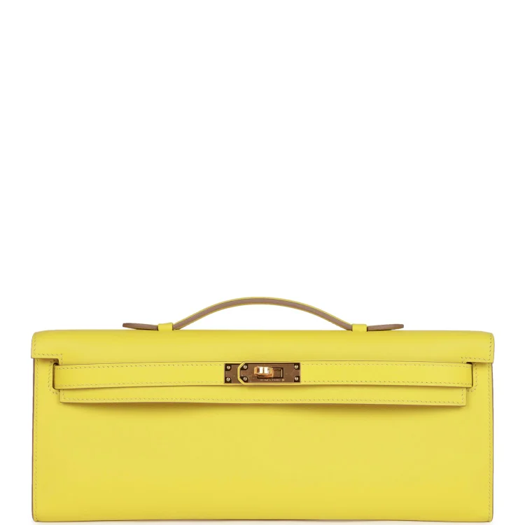 This Kelly Cut clutch is crafted from vibrant Lime Swift leather, accented with gold hardware and tonal stitching. It features two straps with a front toggle closure and a top flat handle. The interior is lined in matching Lime chèvre leather and includes an open wall pocket.
