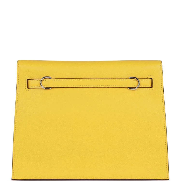 This Kelly Danse II is crafted in vibrant Lime Evercolor leather with palladium hardware and features contrast stitching. It offers two front straps with a flap closure and an adjustable flat shoulder strap, allowing for versatile styling.
