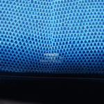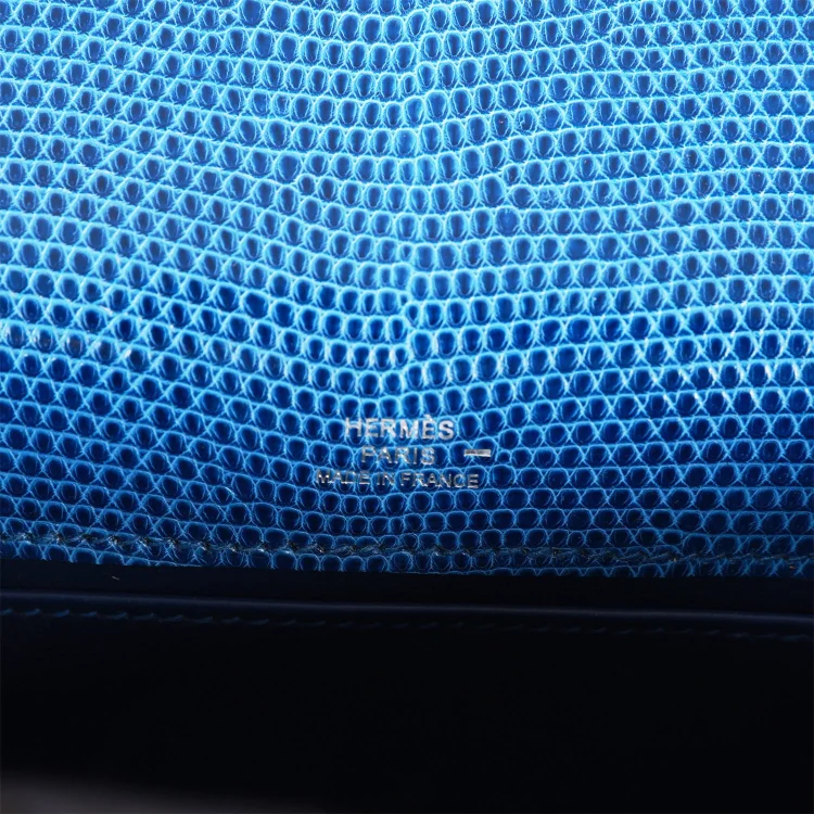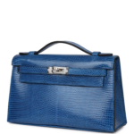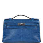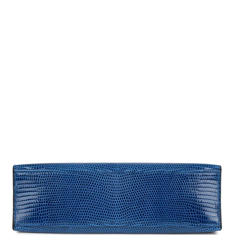 This Mini Kelly Pochette is crafted from Bleu Saphir Veranus Niloticus lizard leather, featuring palladium hardware and tonal stitching. It showcases a front flap with two straps and a center toggle closure, along with a flat top handle.