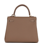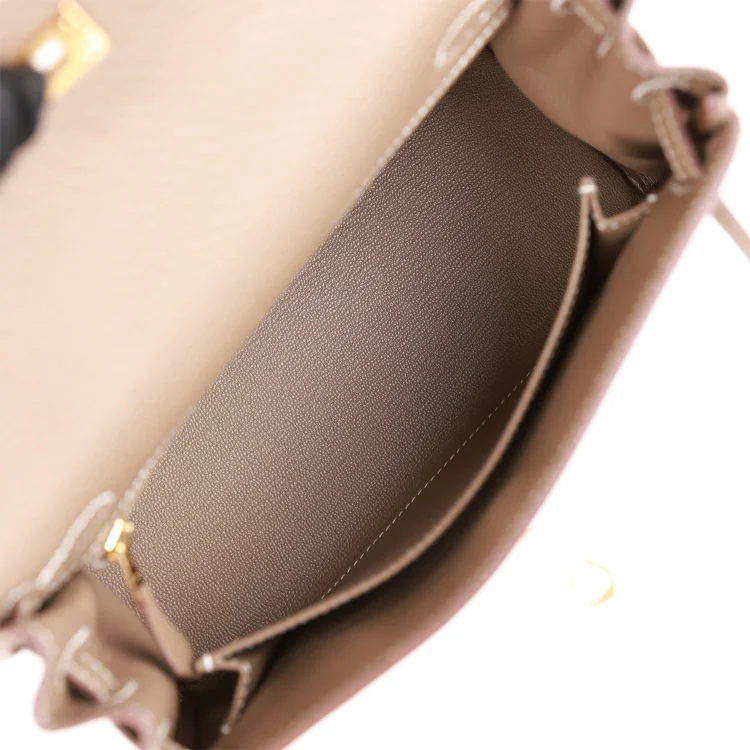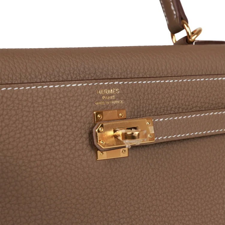This Retourne Kelly is crafted from Etoupe Togo leather with gold hardware and features contrast stitching. It has a front flap, two straps with a center toggle closure, a clochette with lock and two keys, a single rolled handle, and an optional shoulder strap.