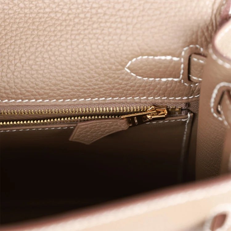 The interior is lined in Etoupe Chevre leather and includes one zip pocket with an “H” engraved pull, as well as one open pocket on the opposite side.