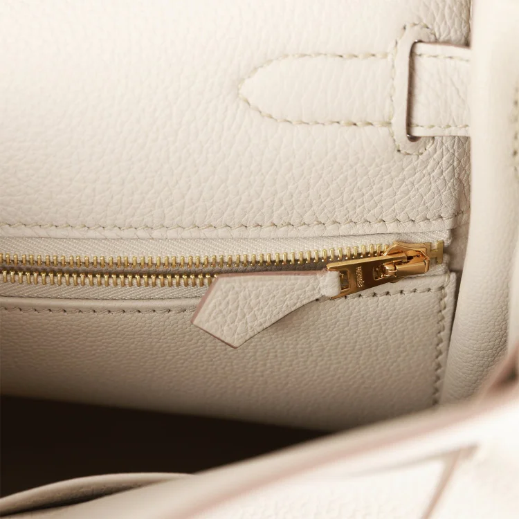 The interior is lined in matching Beton chèvre leather and includes one zip pocket with an “H” engraved pull, as well as two open pockets on the opposite side.