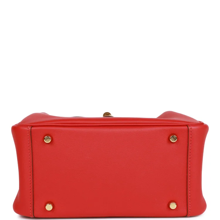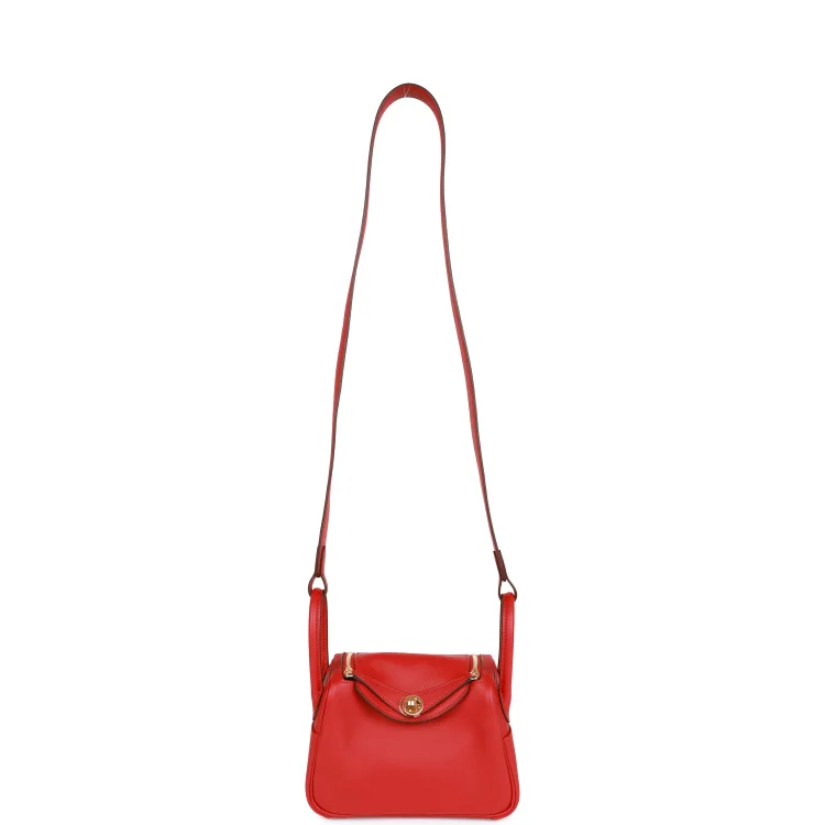 This Mini Lindy is crafted in Rouge Piment Swift leather with gold hardware, featuring tonal stitching, double zipper pulls, a front Hermès twist-lock closure, single exterior pockets on each side, and two rolled top handles connected by a flat shoulder strap.
