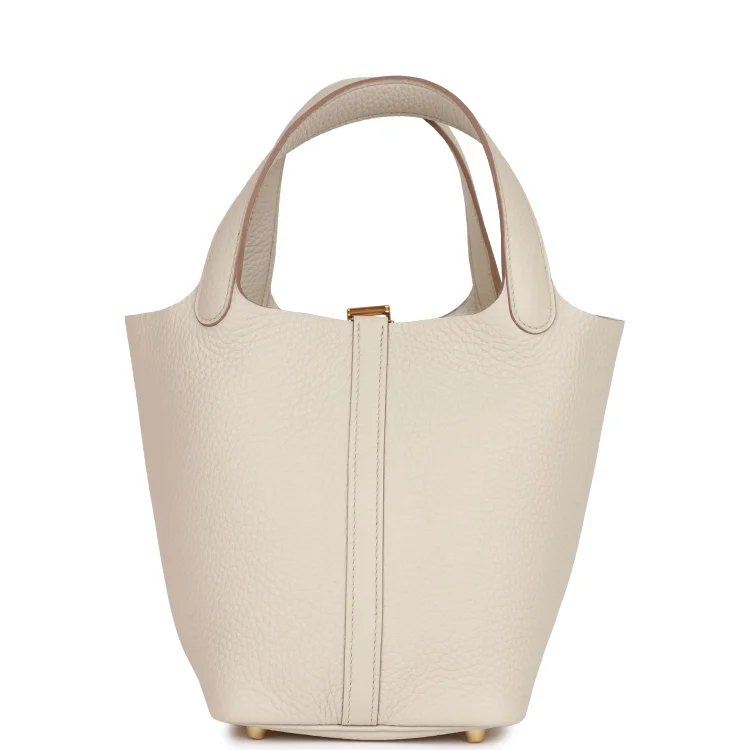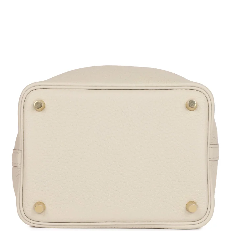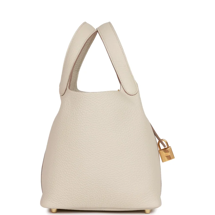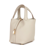 This Picotin Lock is in Beton Clemence leather with gold hardware and features tonal stitching and two top handles.