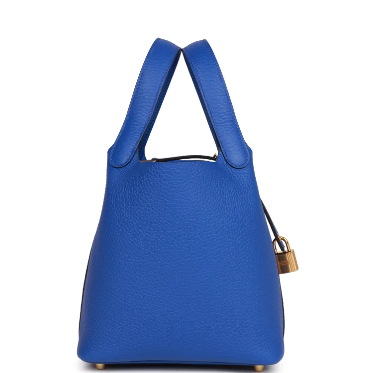 This Picotin Lock is crafted from Bleu Royal Clemence leather with gold hardware and tonal stitching. It features two top handles and a pull-through closure secured by a padlock.
