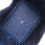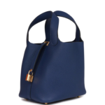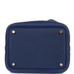 This Picotin Lock is crafted from Bleu Saphir Clemence leather with gold hardware and tonal stitching. It features two top handles and a pull-through closure secured by a padlock.The interior is lined in Bleu Saphir natural leather and includes no interior pockets.