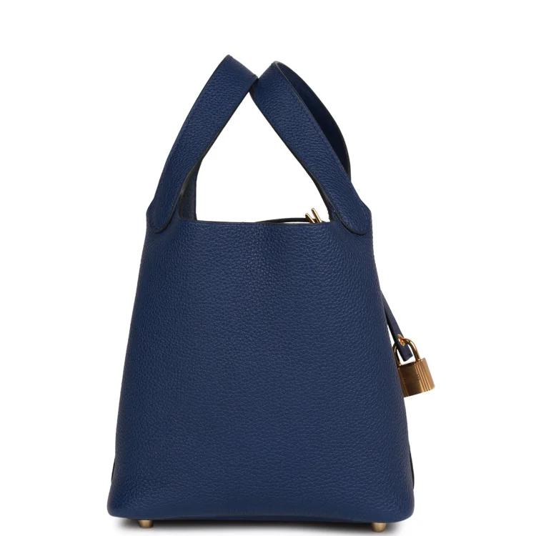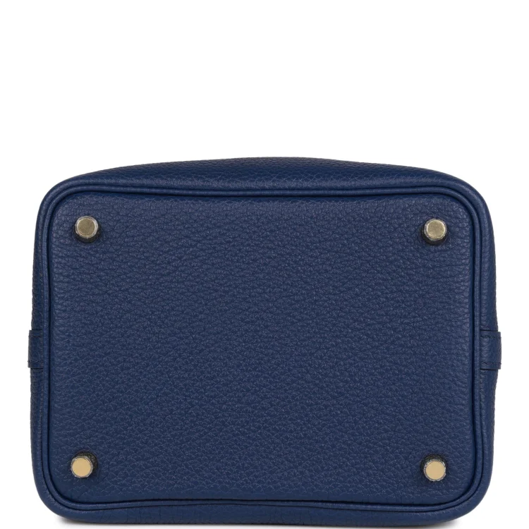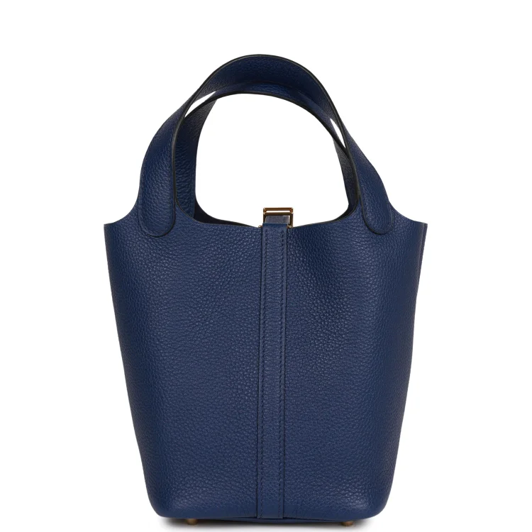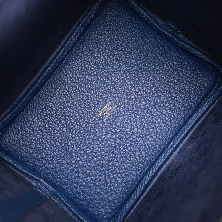 This Picotin Lock bag is crafted in Bleu Saphir Maurice leather with palladium hardware and features tonal stitching and dual top handles. The interior is lined in matching Bleu Saphir natural leather, with no interior pockets. It has a pull-through closure secured by a padlock.