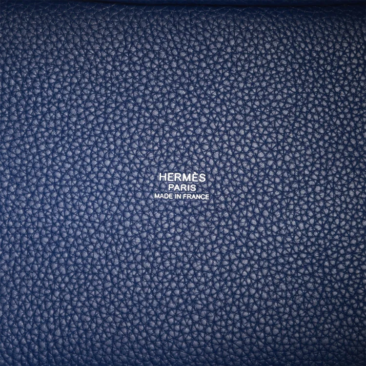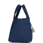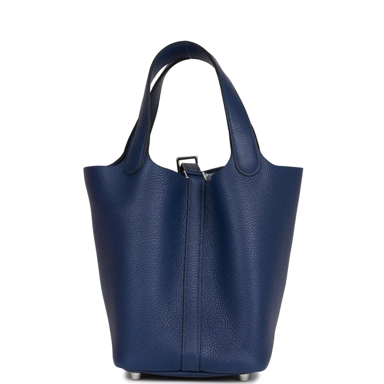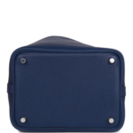 This Picotin Lock is crafted from Bleu Saphir Maurice leather with palladium hardware and features tonal stitching and dual top handles. The interior is lined in Bleu Saphir natural leather, with no interior pockets. It secures with a pull-through closure and padlock.