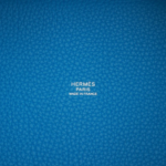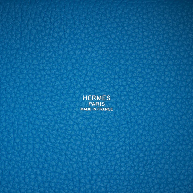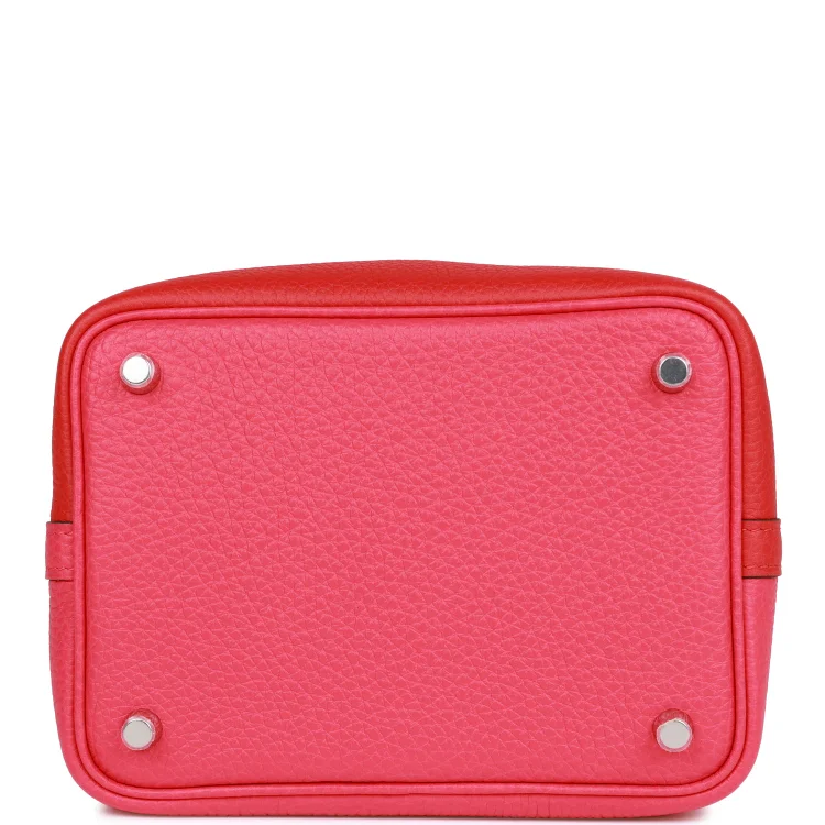 This Casaque Picotin features Rouge de Coeur, Rose Extreme, and Bleu Zanzibar Clemence leather with palladium hardware. It is accented with tonal stitching and includes two top handles. The interior is lined with natural leather, has no interior pockets, and features a pull-through closure secured by a padlock.
