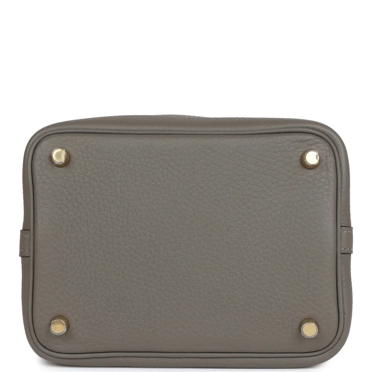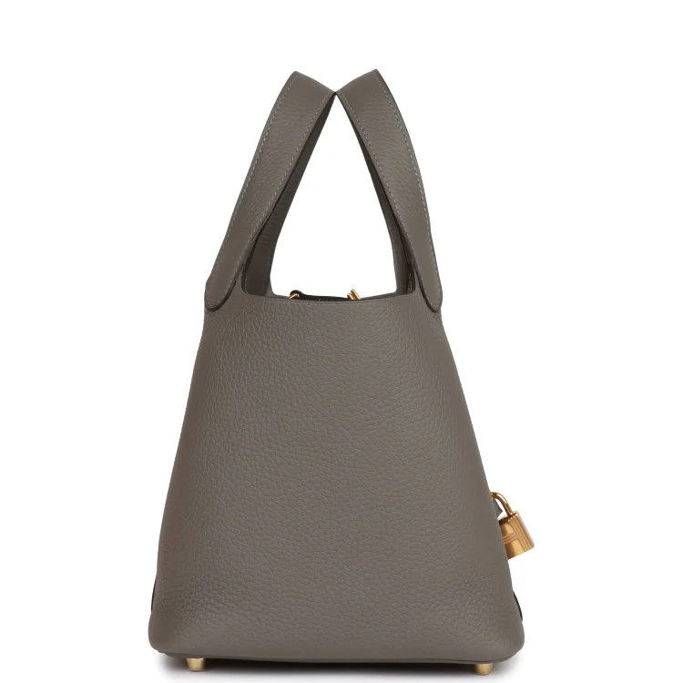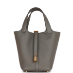 This Picotin Lock is crafted from Gris Meyer Clemence leather with gold hardware and tonal stitching. It features two top handles and a pull-through closure secured by a padlock. The interior is lined with natural Gris Meyer leather and has no interior pockets.