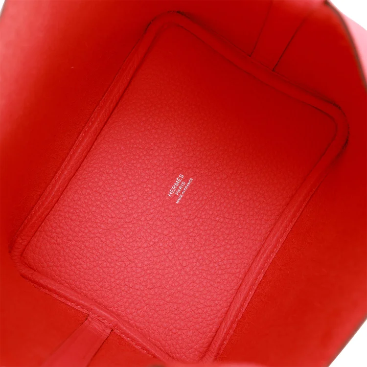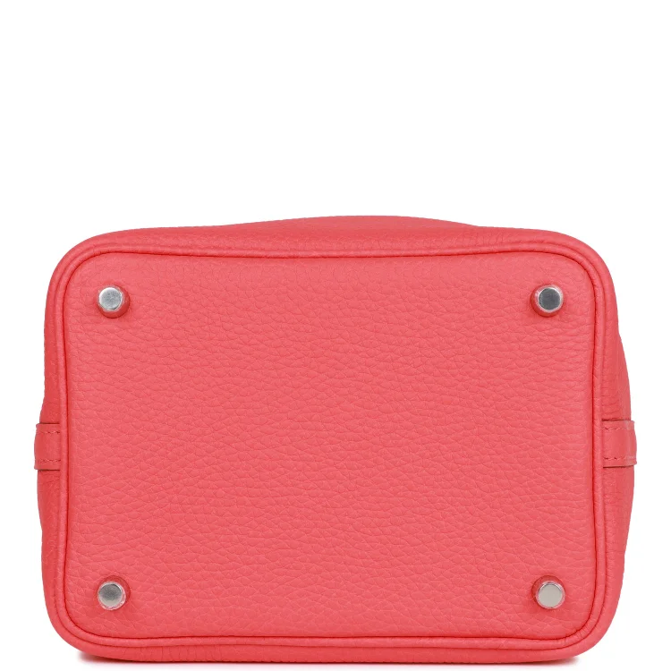 This Picotin Lock bag is crafted from Rose Texas Clemence leather with palladium hardware and tonal stitching. It features two top handles and a pull-through leather strap closure secured by the iconic padlock.