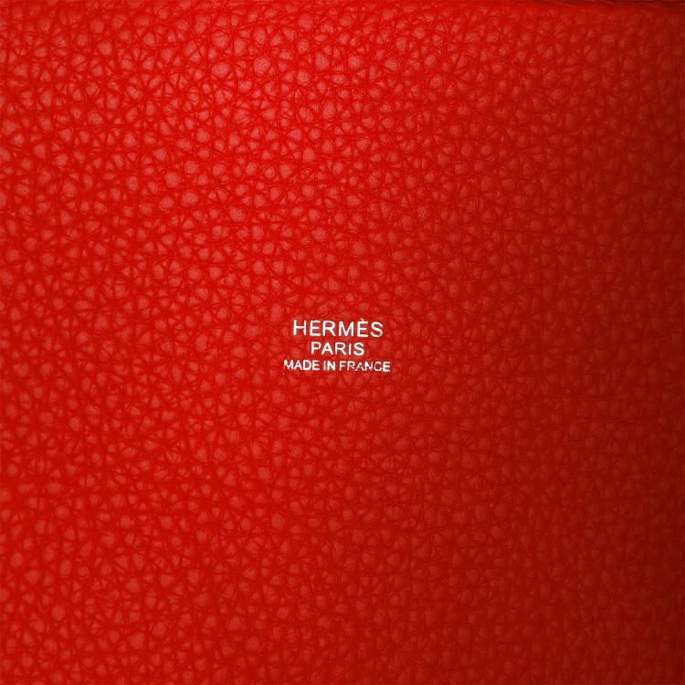 This Picotin Lock bag is crafted from vibrant Vermillion Clemence leather, accented with palladium hardware and tonal stitching. It features two top handles and a pull-through strap closure secured by a signature Hermès padlock.