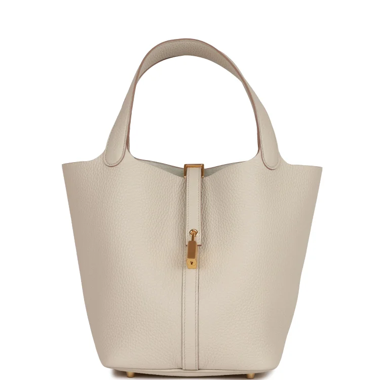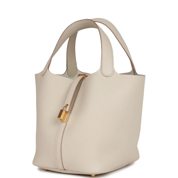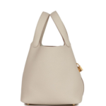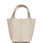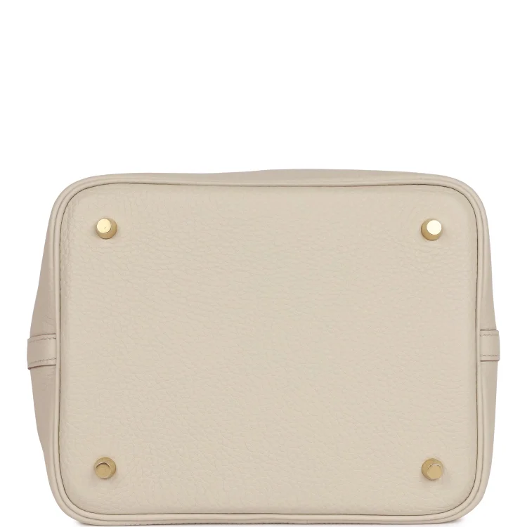 This Picotin Lock is crafted from Beton Clemence leather with gold hardware and tonal stitching. It features two top handles and a leather pull-through closure secured by a signature Hermès padlock.