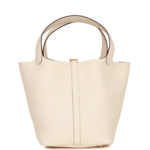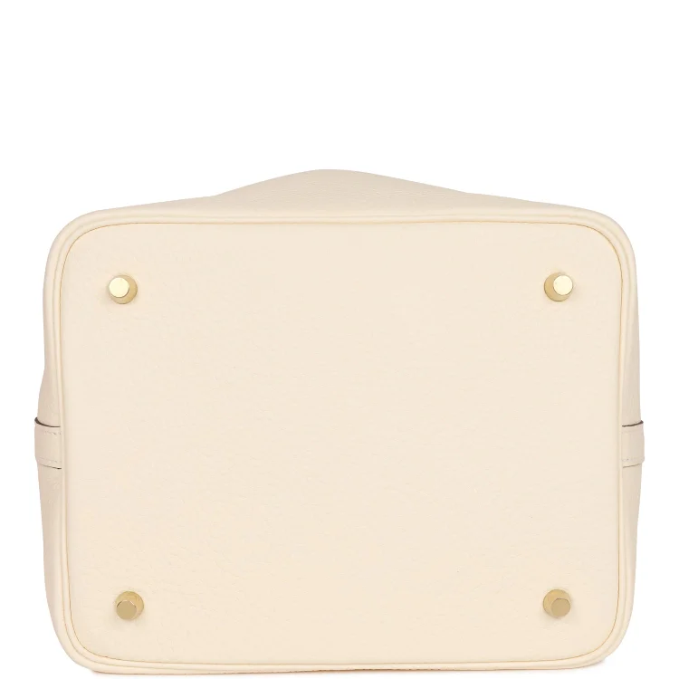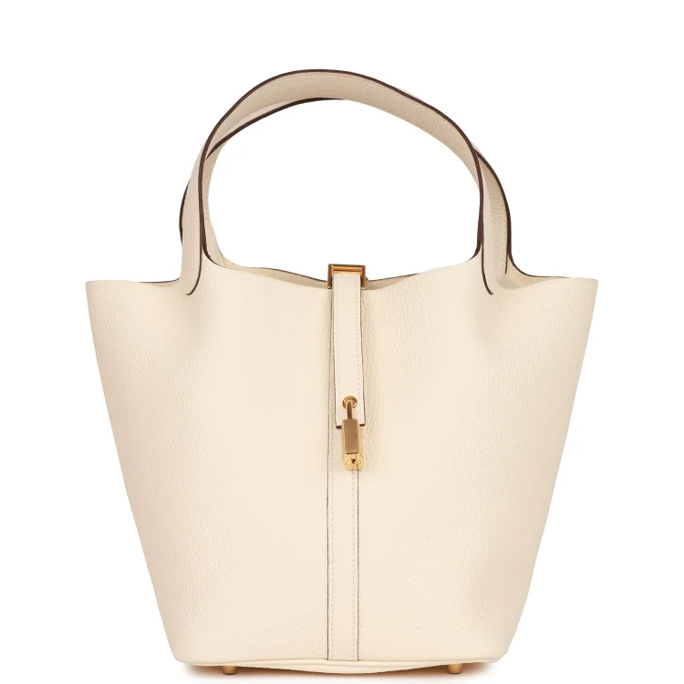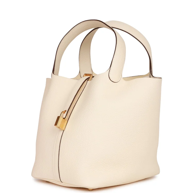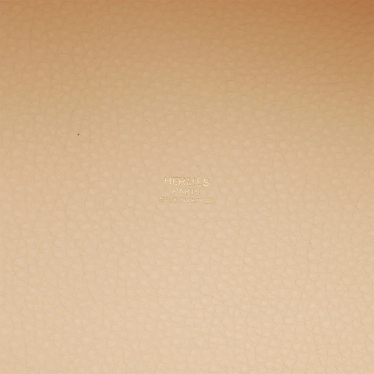 This Picotin Lock is crafted from Nata Clemence leather with gold hardware and tonal stitching. It features two top handles and a leather pull-through strap closure secured by the iconic Hermès padlock.