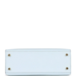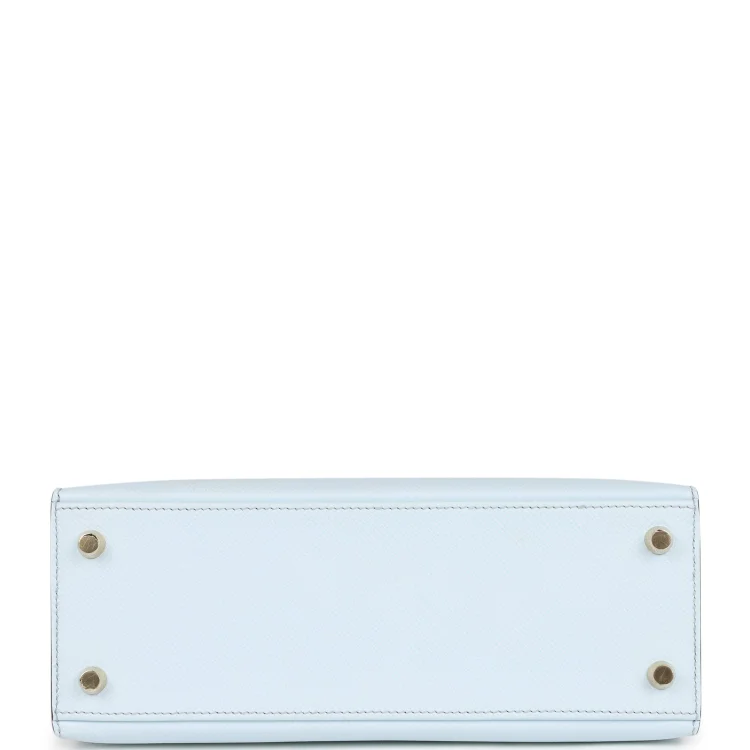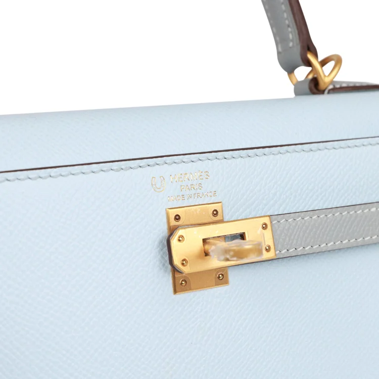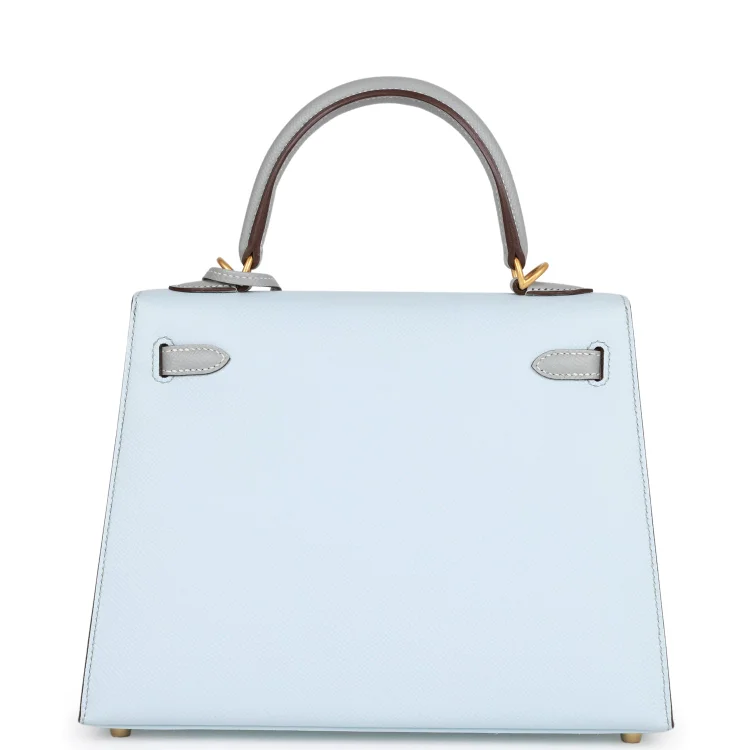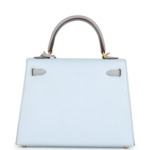 This Special Order Kelly, crafted in the signature Sellier style, features luxurious Bleu Brume and Bleu Glacier Epsom leather, complemented by brushed gold hardware and contrast stitching. The bag is designed with two straps and a front toggle closure, accompanied by a clochette with lock and two keys. A single rolled handle and a removable shoulder strap offer versatility.